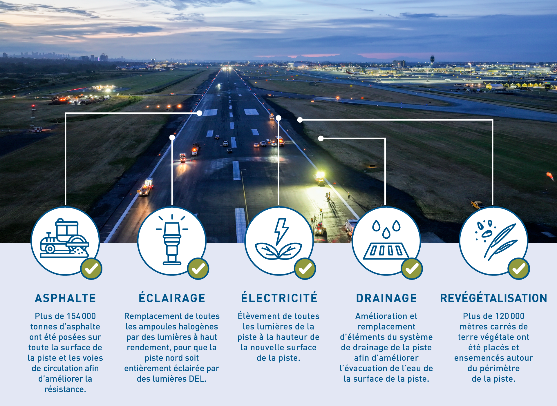 L’asphaltage et l’infrastructure ainsi améliorés permettront de mieux servir les partenaires d’aviation de YVR et les compagnies aériennes pour les années à venir. Les travaux réalisés dans le cadre du programme de la piste nord comprenaient :